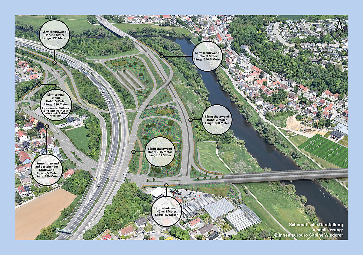Die Planungen zum Umbau des Lappersdorfer Kreisels beinhalten umfassende Maßnahmen zum Lärmschutz für die Anwohnenden. Gleichzeitig schaffen geplante Rampen neue Verkehrsbeziehungen, die zu einem flüssigen Verkehr im Lappersdorfer Kreisel beitragen werden. Die konkreten Maßnahmen sind auf den Infografiken abgebildet.