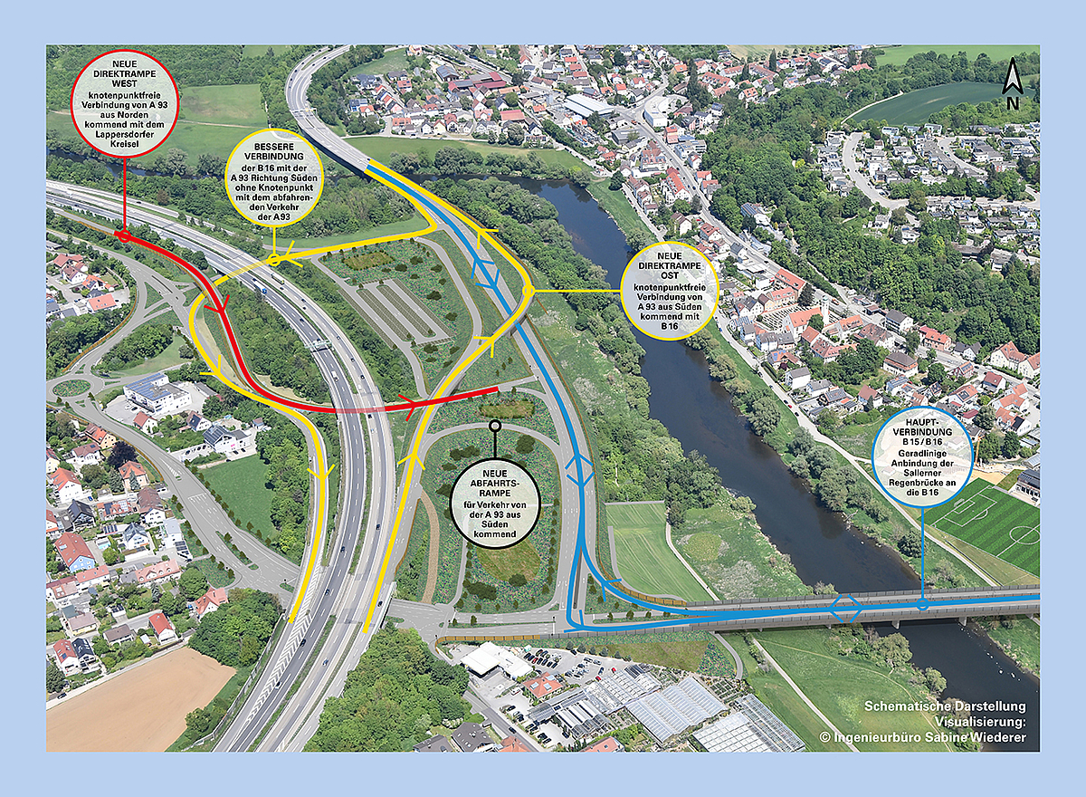 Zusätzlich wird eine neue Verbindung zwischen der B 15 (Nordgaustraße und Sallerner Regenbrücke) und der B 16 geschaffen. Diese Verbindung ermöglicht eine direkte Weiterfahrt in Richtung Norden oder Süden, ohne dass der Verkehr durch den bisherigen Verteilerring geführt werden muss. Der Verkehr aus der Stadt Regensburg, der über die Sallerner Regenbrücke kommt, wird über diese Verbindungsspange effizient in Richtung B 16 oder A 93 geleitet.